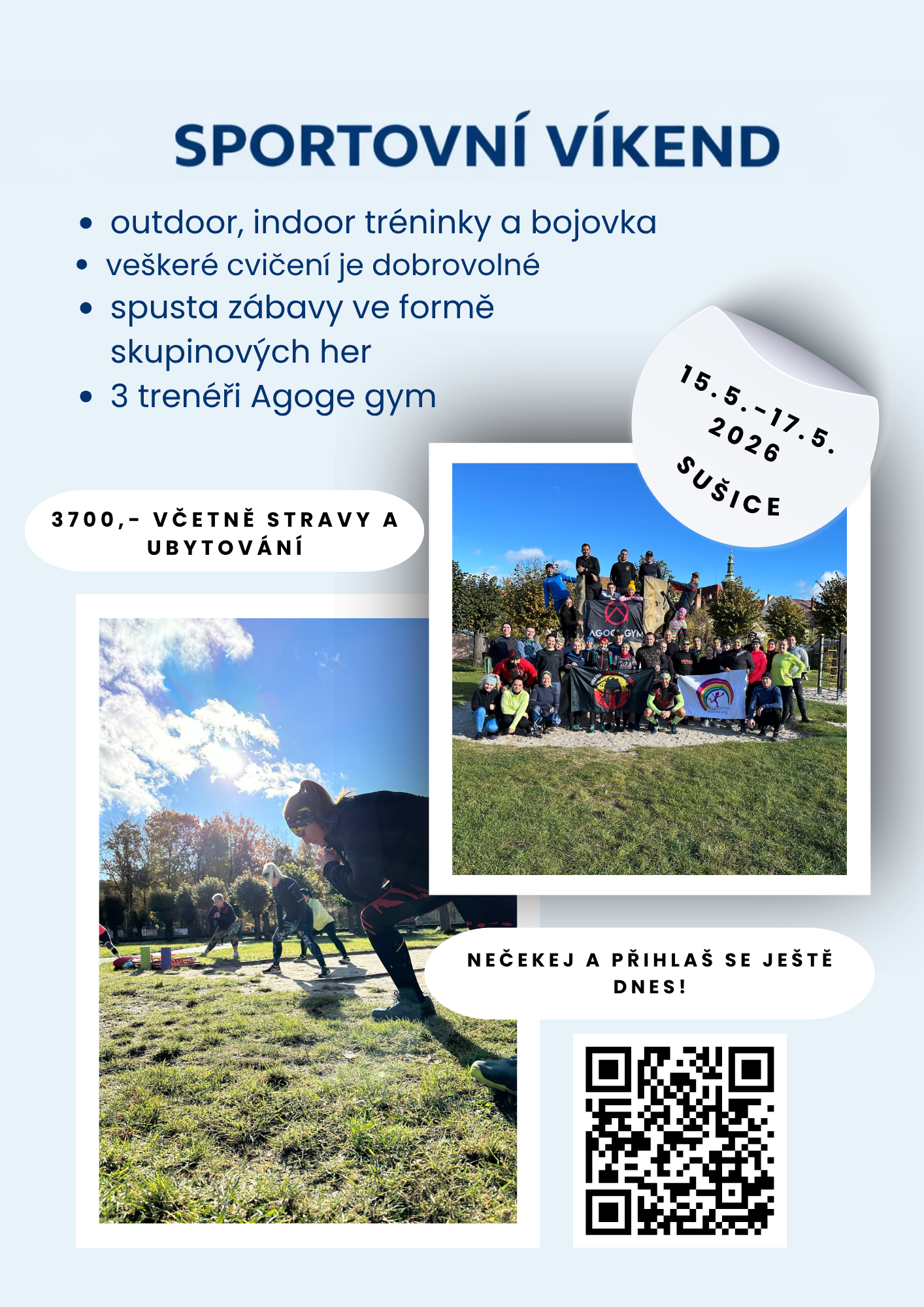 Najdeš u nás intervalové tréninky, tabatu, kruhové tréninky, individuální přístup, běžecké vyžití, horské výpravy, adrenalinové zážitky a dokonce i charitativní akce. Všechno děláme společně. Neodsuzujeme, když se rozhodneš odpočinout. Naopak, budeme na tebe čekat, až se vrátíš a budeš připraven znovu bojovat.